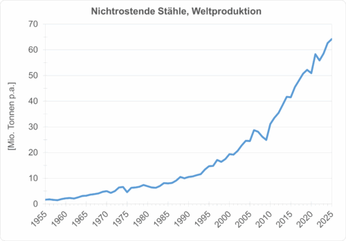 Die World Stainless Association (worldstainless) hat Kennzahlen für das Jahr 2025 veröffentlicht. Diese zeigen, dass die Edelstahlproduktion im Vergleich zum Vorjahr um 2,1 % auf den neuen Höchststand von 64,2 Millionen Tonnen gestiegen ist.